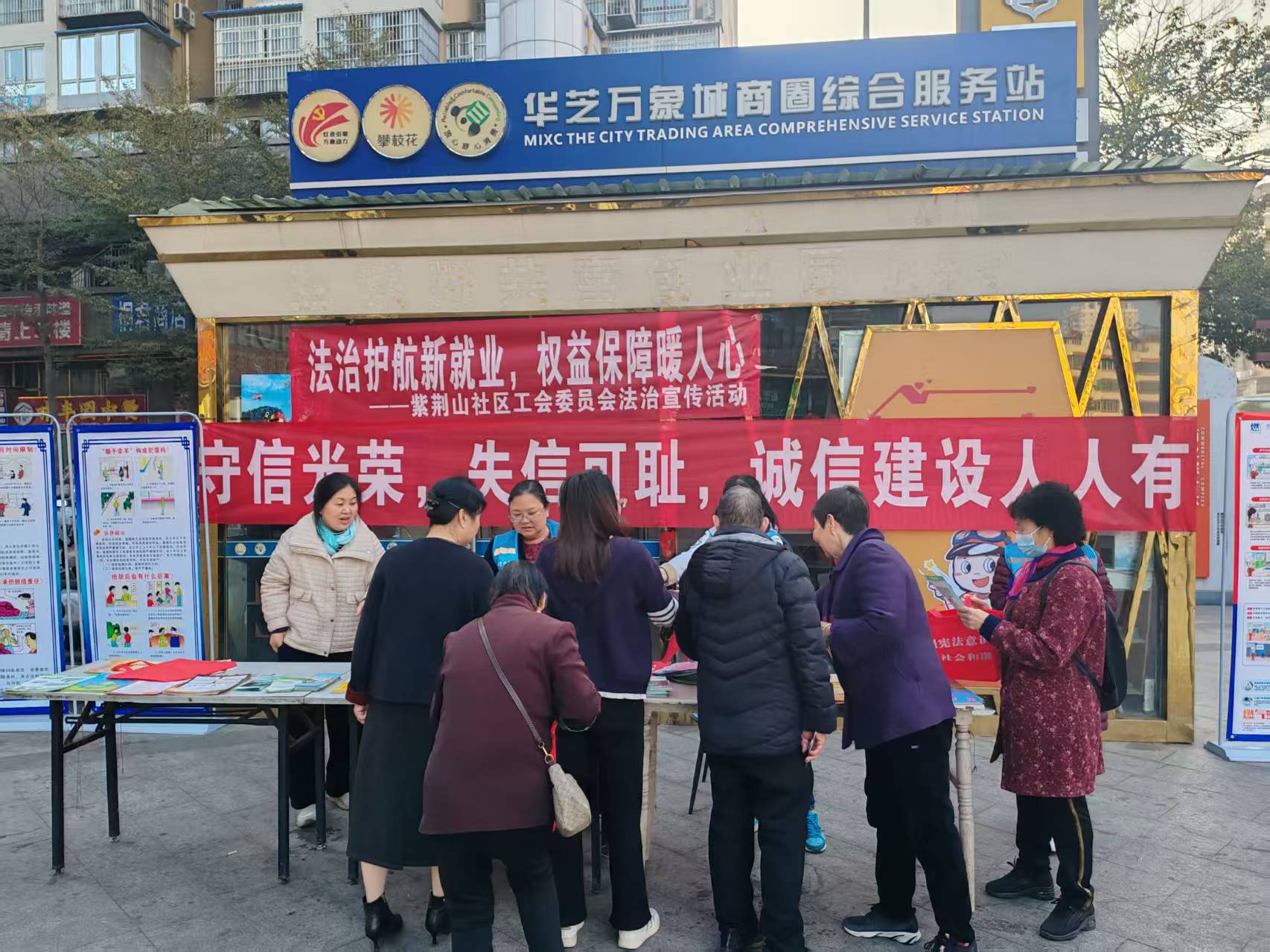 一大早,社区的“诚信宣传员”和“法治小讲师”就忙活起来。他们在广场上支起展板、摆好资料,把“守信光荣,失信可耻,诚信建设人人有责”“法治护航新就业,权益保障暖人心”的横幅挂得醒目又亮眼。路过的居民、逛街的市民、商圈里的商户,都被这热闹的阵仗吸引过来,好奇的围在宣传台前。